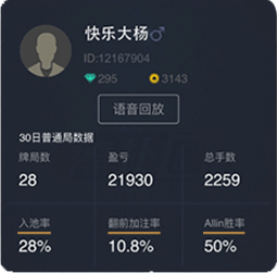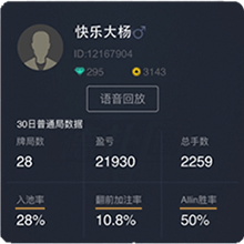 01 在战绩中分别记录玩家今日、7日、30日的数据。数据包括在对应时间内,玩家参与的牌局数、手牌数目、总盈亏、入池率、翻前加注率、Allin胜率。